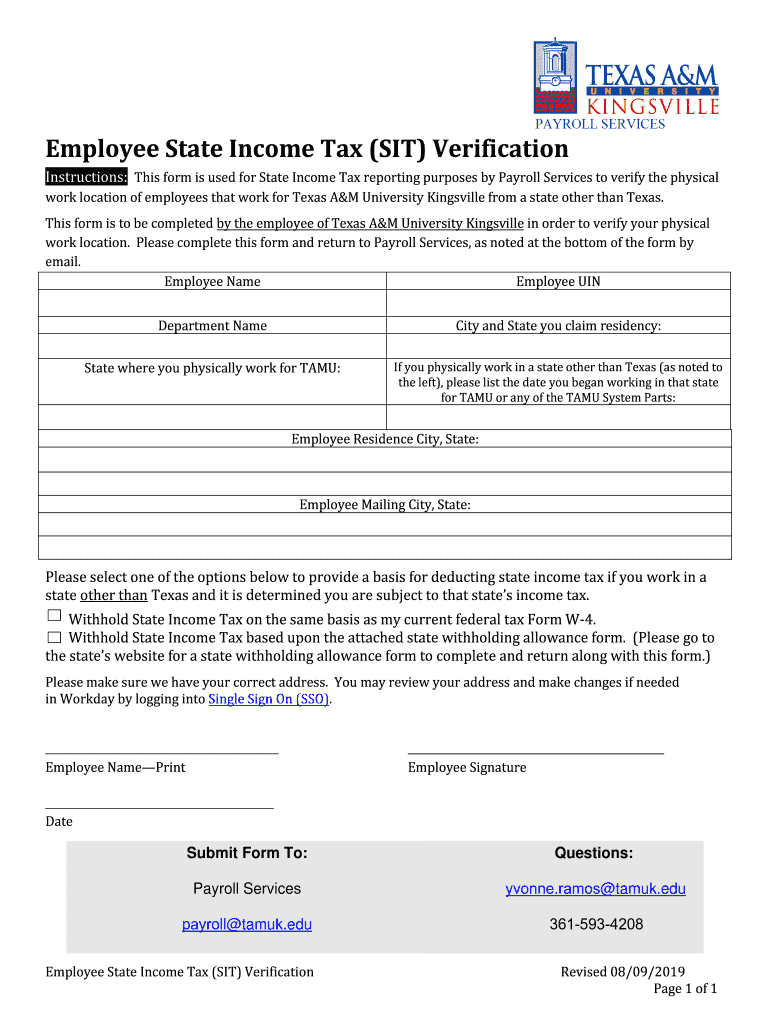 Employee State Income Tax (SIT) Verification Instructions: This form is used for State Income Tax reporting purposes by Payroll Services to verify the physical work location of employees that work