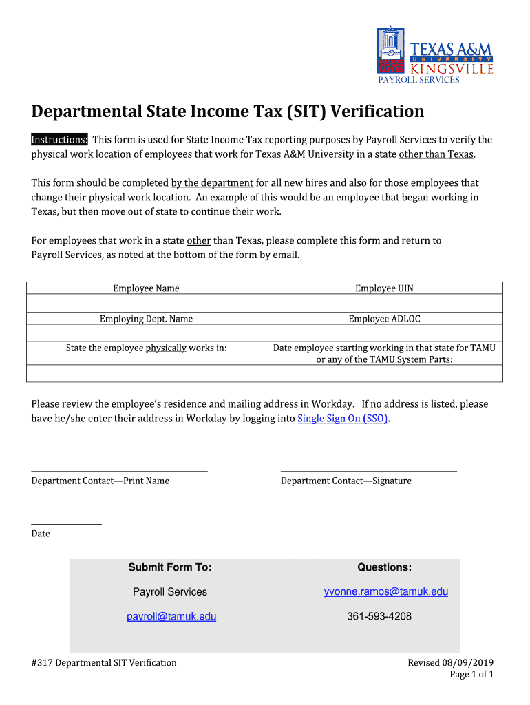 Departmental State Income Tax (SIT) Verification Instructions: This form is used for State Income Tax reporting purposes by Payroll Services to verify the physical work location of employees that