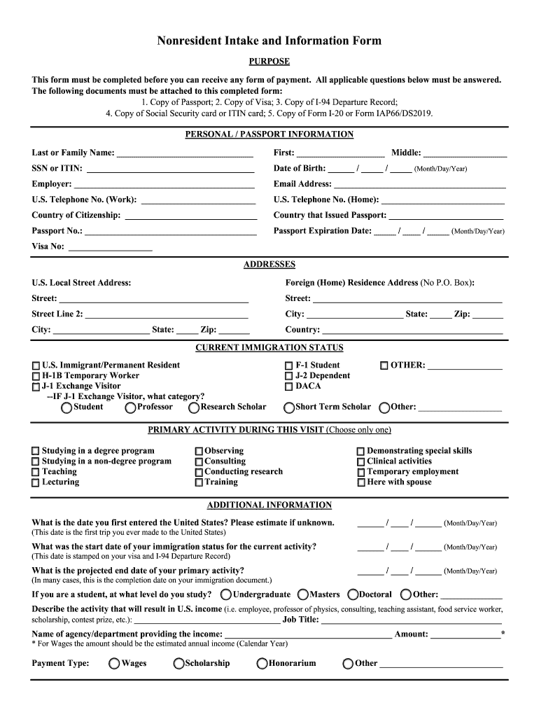 Nonresident Intake and Information Form PURPOSE This form must be completed before you can receive any form of payment. All applicable questions below must be answered. The following documents must