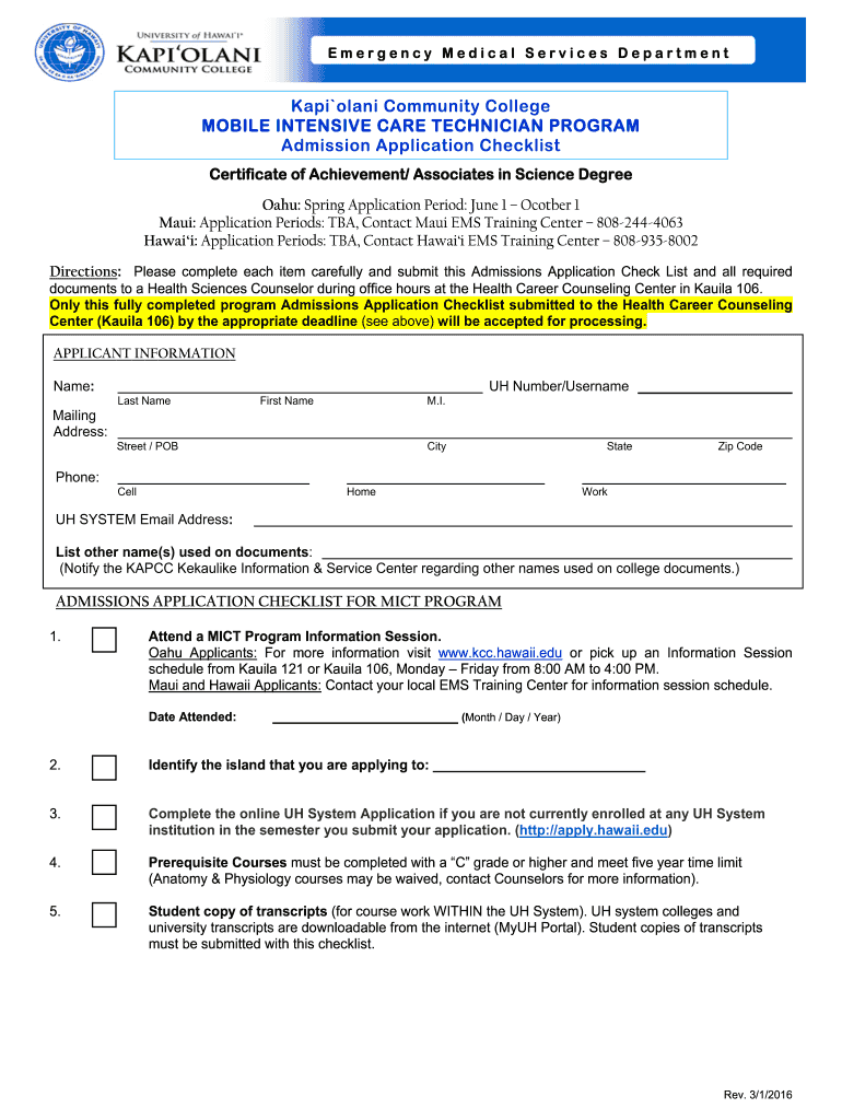 Emergency Medical Services Departmental Omani Community College MOBILE INTENSIVE CARE TECHNICIAN PROGRAM Admission Application Checklist Certificate of Achievement/ Associates in Science Degree Oahu: