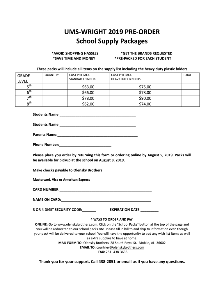 UPRIGHT 2019 PREORDERSchool Supply PackagesGRADELEVEL5th6th7th8th×AVOID SHOPPING HASSLES×SAVE TIME AND MONEY×GET THE BRANDS REQUESTED×PREPACKED FOR EACH STUDENTThese packs will include all items