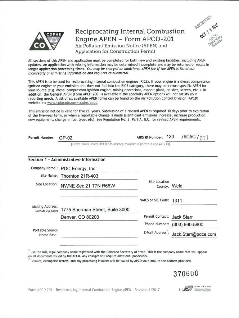 #, A. V “, Reciprocating Internal Combustion Engine OPEN Form APCD201c. “9orJIAir Pollutant Emission NoticeApplication:(OPEN)and for Construction Permit application must be completed for both