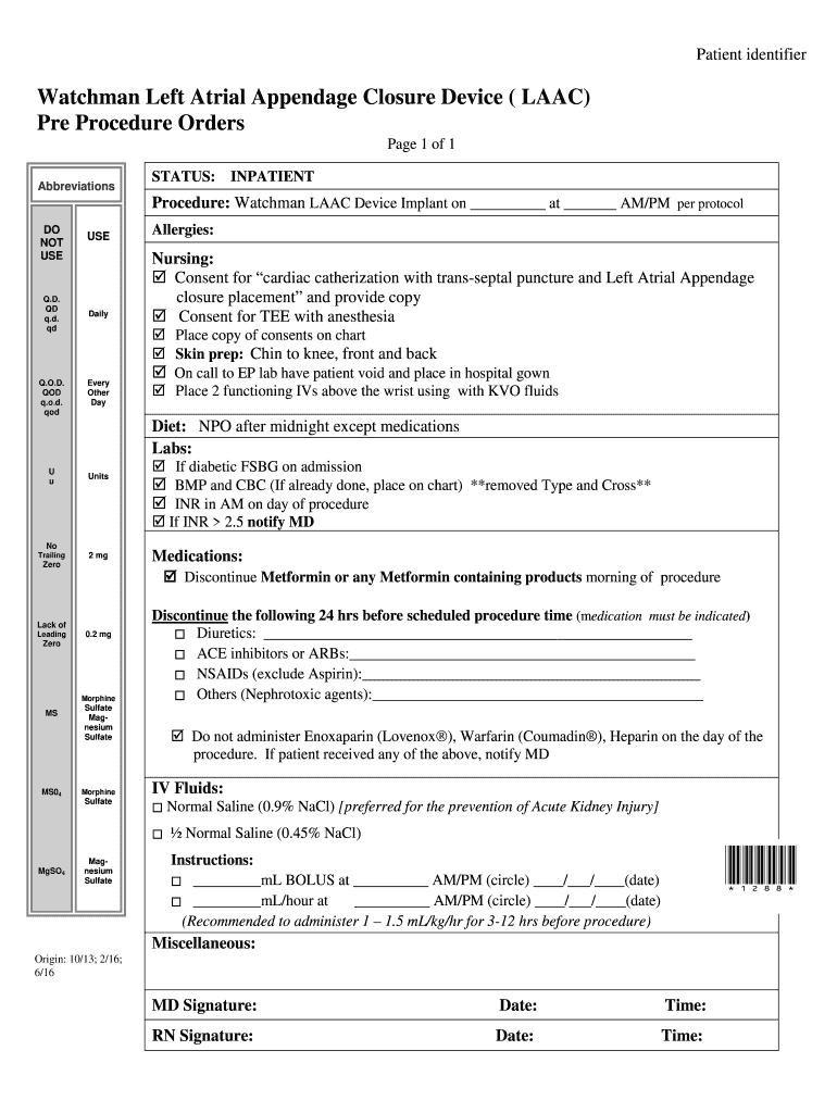 Patient identifierWatchman Left Atrial Appendage Closure Device (LAAC) PRE Procedure Orders Page 1 of 1 AbbreviationsSTATUS:INPATIENTProcedure: Watchman LAAC Device Implant on at AM/PM per protocol