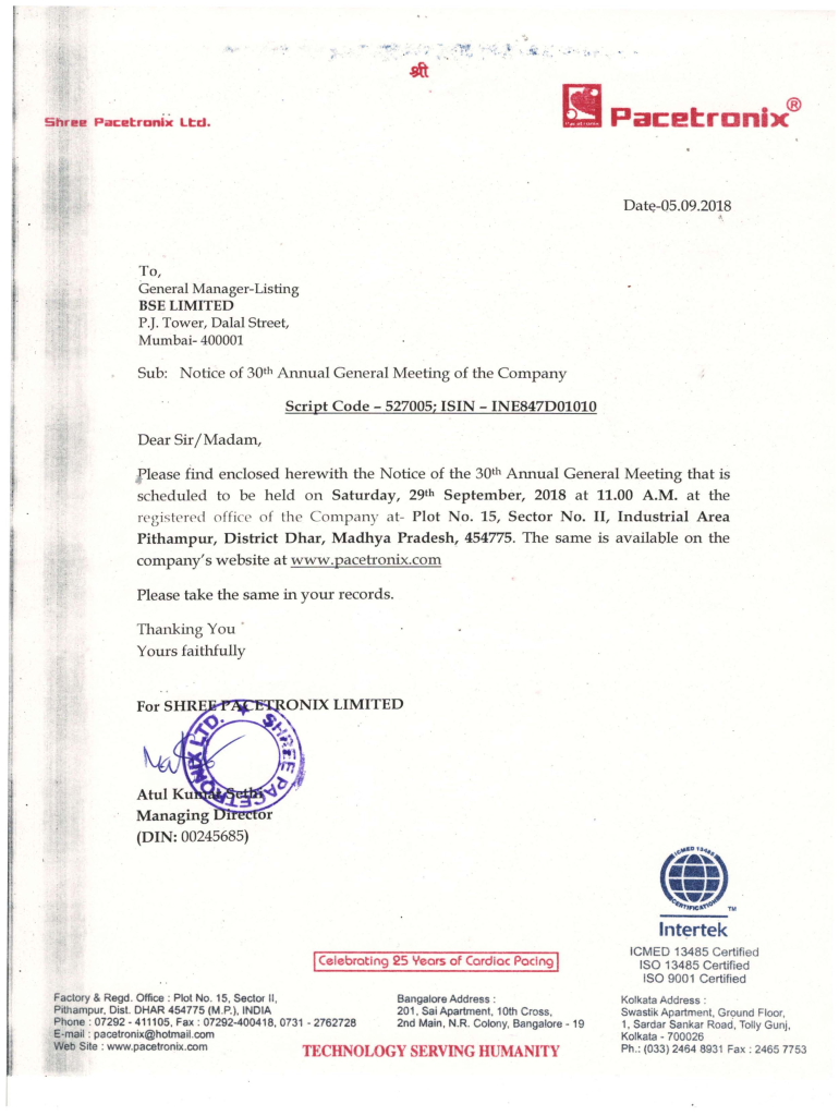 . ... Three Piilcetranlx.... “. . r.J. ..., 't. ! 'Io :, '. . .II PacetrDnixld. Dat05.09.2018. To, General ManagerListingBSE LIMITED P.J. Tower, Daley Street, Mumbai 400001Sub: Notice of 30th Annual