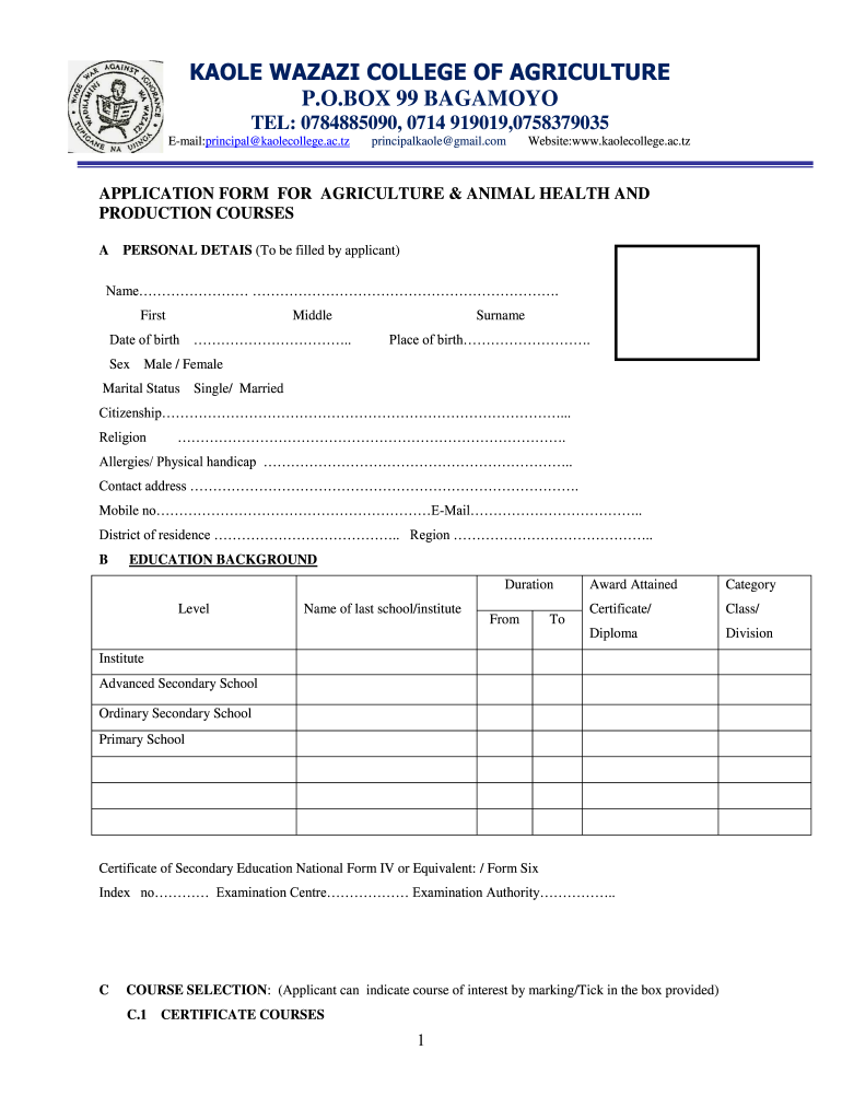 KALE WASABI COLLEGE OF AGRICULTURE P.O.BOX 99 BIGAMY TEL: 0784885090, 0714 919019,0758379035 Email:principal kaolecollege.ac.tzprincipalkaole Gmail.website:www.kaolecollege.ac.tzAPPLICATION FORM FOR