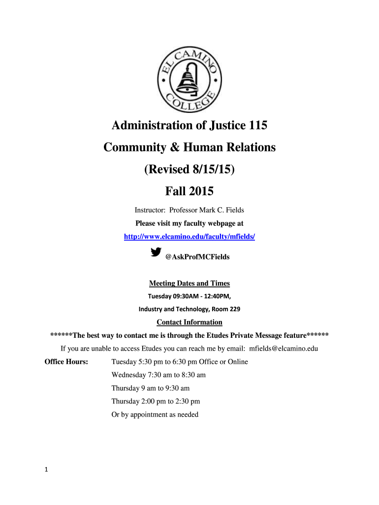 Administration of Justice 115 Community & Human Relations (Revised 8/15/15) Fall 2015 Instructor: Professor Mark C. Fields Please visit my faculty webpage at http://www.elcamino.edu/faculty/mfields/