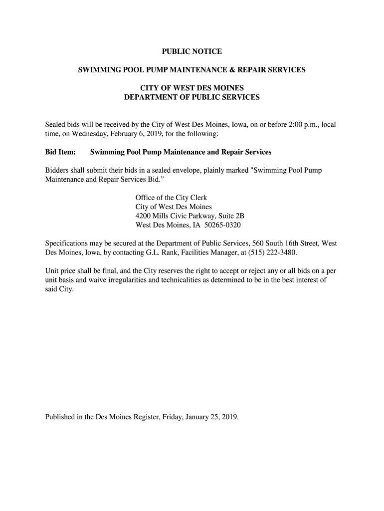 PUBLIC NOTICE SWIMMING POOL PUMP MAINTENANCE & REPAIR SERVICES CITY OF WEST DES MOINES DEPARTMENT OF PUBLIC SERVICESSealed bids will be received by the City of West Des Moines, Iowa, on or before