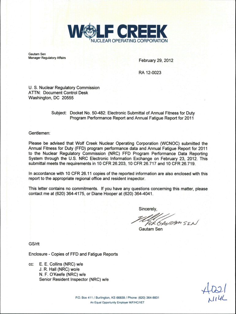 Get the free Wolf Creek Nuclear Operating Corporation - Annual Fitness for Duty ...