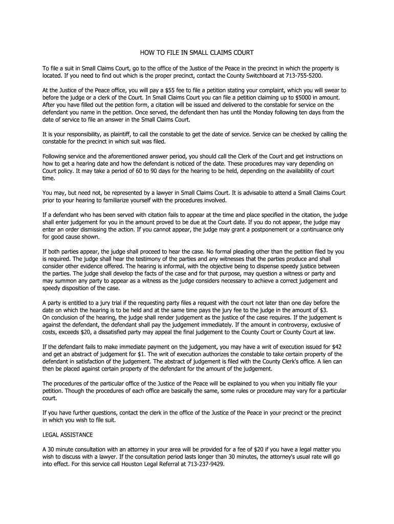 To file a suit in Small Claims Court, go to the office of the Justice of the Peace in the precinct in which the property is