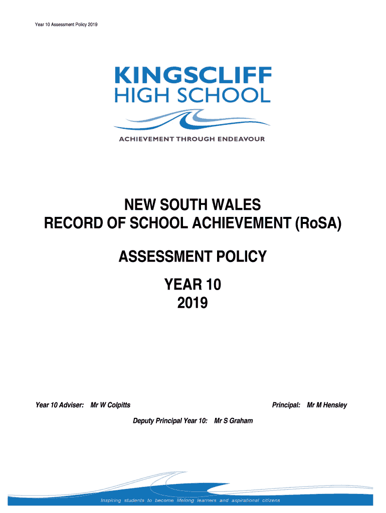 Year 10 Assessment Policy 2019NEW SOUTH WALES RECORD OF SCHOOL ACHIEVEMENT (Rosa) ASSESSMENT POLICY YEAR 10 2019Year 10 Advisers: Mr W ColpittsPrincipal: Mr M Hensley Deputy Principal Year 10: Mr