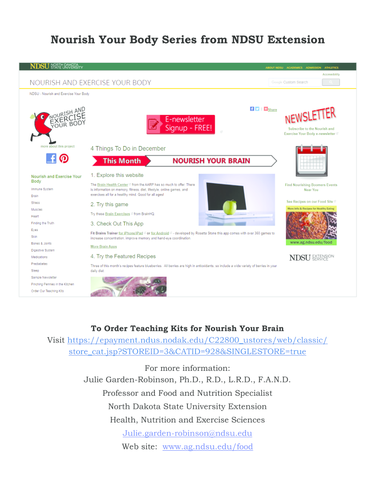 Nourish Your Body Series from DSU Extension Order Teaching Kits for Nourish Your Brain Visit https://epayment.ndus.nodak.edu/C22800 stores/web/classic/ store cat.jsp?STOREID3&CATID928&SINGLESTOREtrue