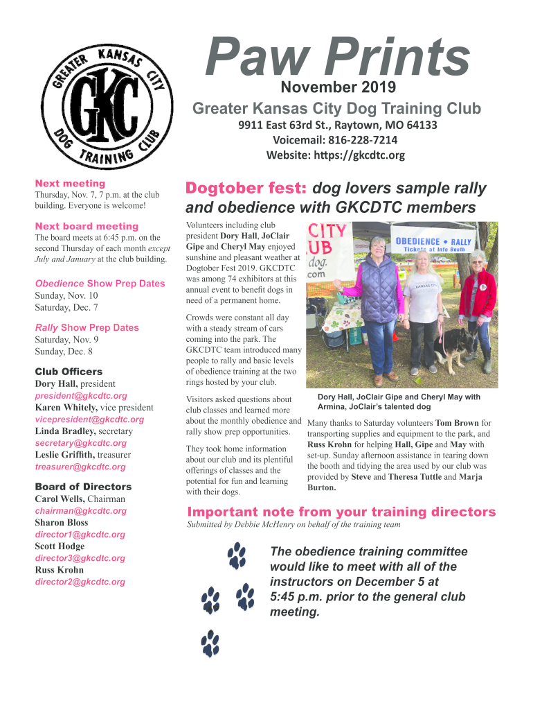 Voicemail: 8162287214Website: https://gkcdtc.orgNext meetingDogtober fest: dog lovers sample rally