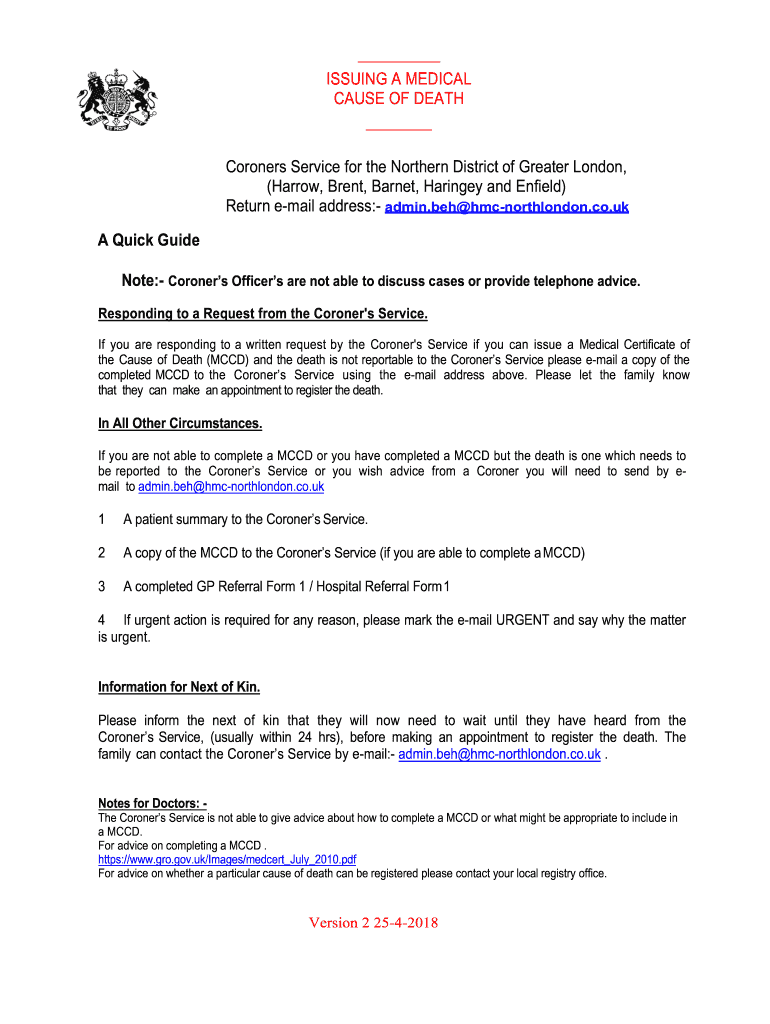 ISSUING A MEDICAL CAUSE OF DEATH Coroners Service for the Northern District of Greater London, (Harrow, Brent, Barnes, Harbinger and Enfield) Return email address: admin.BEH hmcnorthlondon.co.UK A