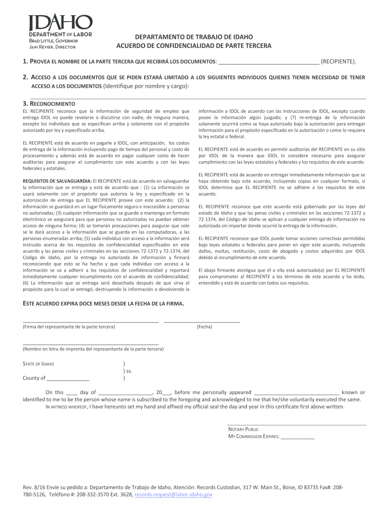 DEPARTMENT DE TRIBAL DE IDAHO ACTED DE CONFIDENCIALIDAD DE PART TERCEIRA 1. PROVE AEL HOMBRE DE LAP ARTE TERCEIRA QUE RECITER LOS DOCUMENTS: (RECIPIENT). 2. ACCESS A LOS DOCUMENTS QUE SE WIDEN STAR