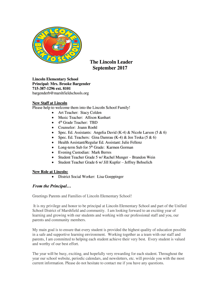 The Lincoln Leader September 2017 Lincoln Elementary School Principal: Mrs. Brooke Bartender 7153871296 ext. 8101 bartender marshfieldschools.org New Staff at Lincoln Please help to welcome them into