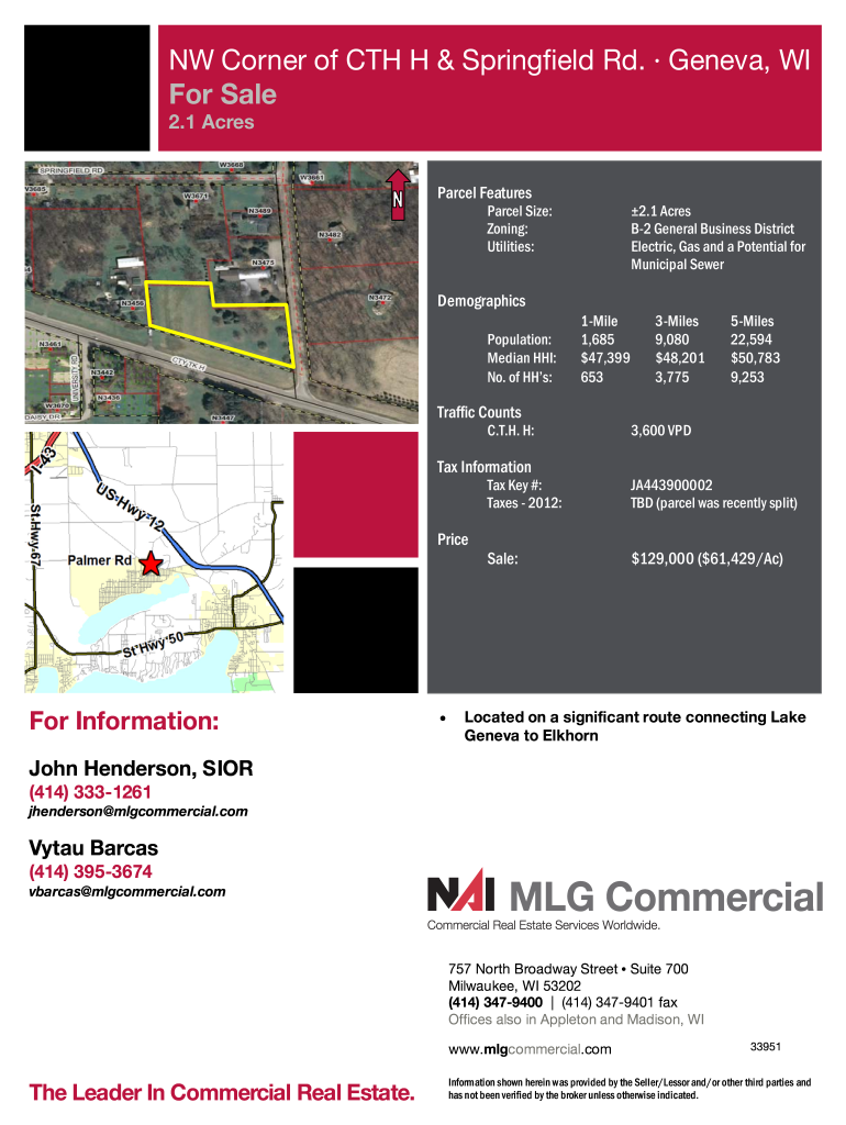 NW Corner of CTH H & Springfield Rd. Geneva, WI For Sale 2.1 AcresParcel FeaturesParcel Size: Zoning: Utilities:2.1 Acres B2 General Business District Electric, Gas and a Potential for Municipal SewerDemographics