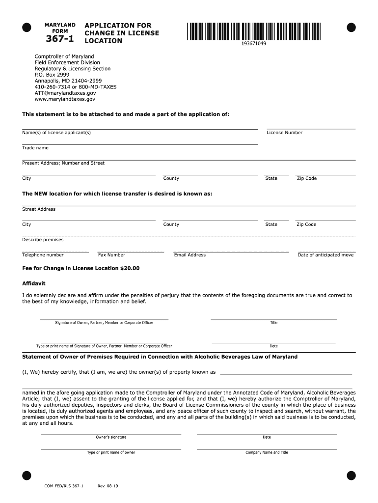MARYLAND FORM3671APPLICATION FOR CHANGE IN LICENSE LOCATIONComptroller of Maryland Field Enforcement Division Regulatory & Licensing Section P.O. Box 2999 Annapolis, MD 214042999 4102607314 or 800MDTAXES