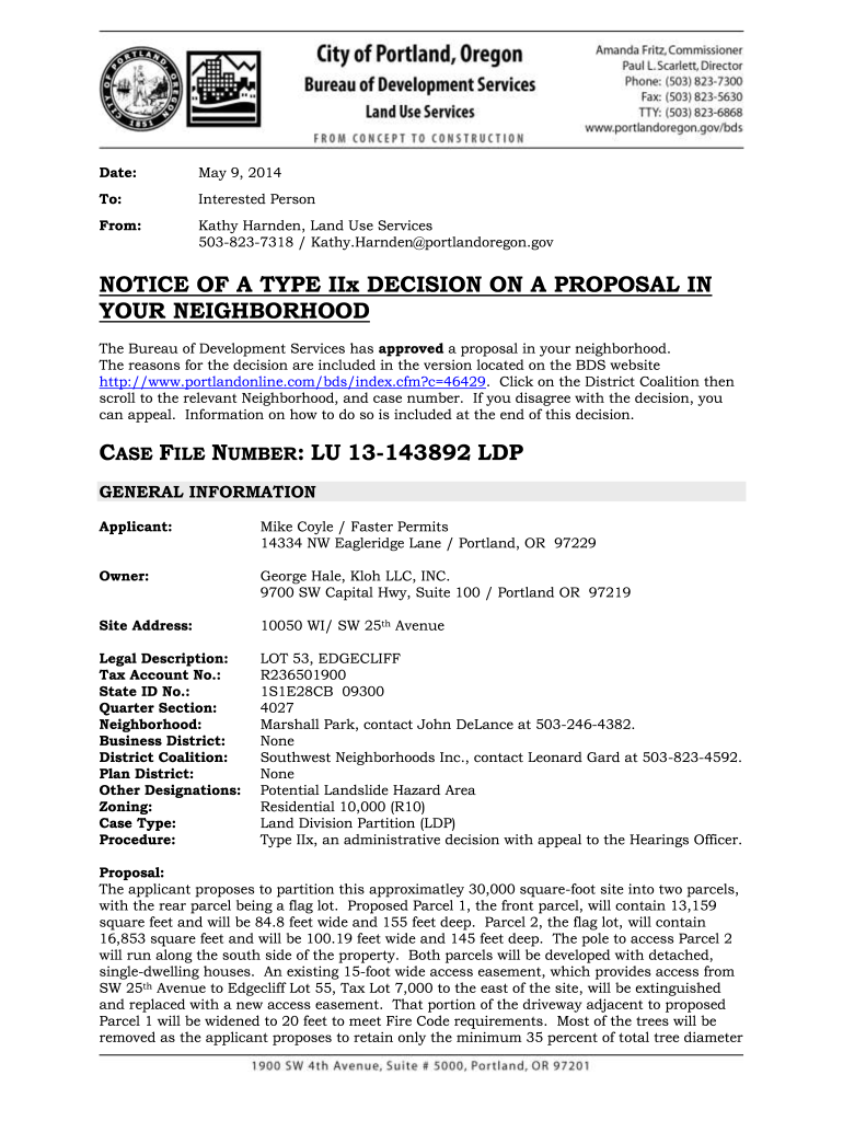 Date:May 9, 2014To:Interested Personhood:Kathy Harden, Land Use Services
