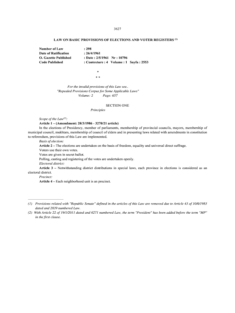 3627 LAW ON BASIC PROVISIONS OF ELECTIONS AND VOTER REGISTERS (1) Number of Law Date of Ratification O. Gazette Published Code Published: 298 : 26/4/1961 : Date : 2/5/1961 NR : 10796 : Contexture