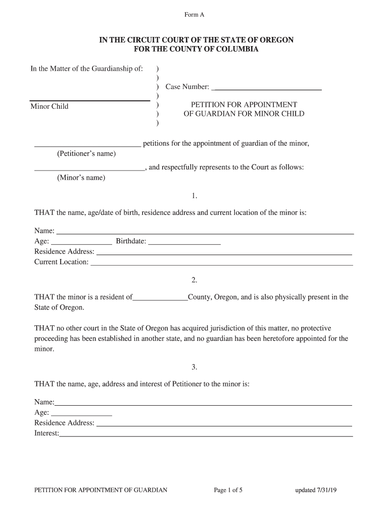 Form AIN THE CIRCUIT COURT OF THE STATE OF OREGON FOR THE COUNTY OF COLUMBIA In the Matter of the Guardianship of:))) Case Number:)) PETITION FOR APPOINTMENT) OF GUARDIAN FOR MINOR CHILD)Minor Child
