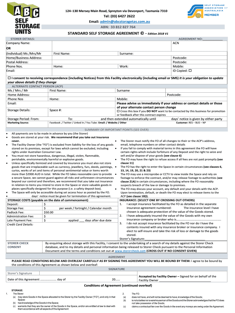 124130 Jersey Main Road, Preston via Devonport, Tasmania 7310Tel: (03) 6427 2622 Email: admin abcstoragetas.com.AU ABN: 33 812 827 764STANDARD SELF STORAGE AGREEMENT Edition 2018 V1 STORE DETAILS:AGREEMENT