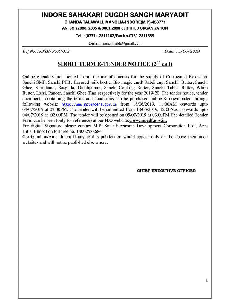 INDORE SAHARA DUG DH SANG MARGARET CHANDRA ALKALI, MANGLIAMANGLIAINDORE(M. P)INDORE’M. P)453771AN ISO 22000: 2005 & 9001:2008 CERTIFIED ORGANIZATION Tel: : (0731) 2811162/Fax No.07312811559 Email: