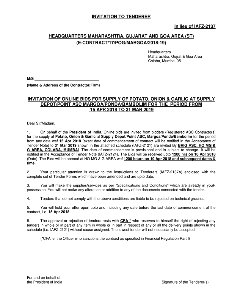 INVITATION TO TENDERER In lieu of IAFZ2137 HEADQUARTERS MAHARASHTRA, GUJARAT AND GOA AREA (ST) (CONTRACT/17/DOG/MARGO/201819) Headquarters Maharashtra, Gujrat & Goa Area Clara, Mumbai05M/S (Name &