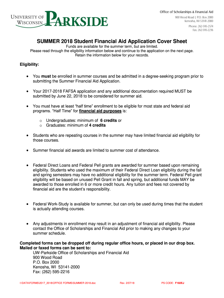 SUMMER 2018 Student Financial Aid Application Cover Sheet