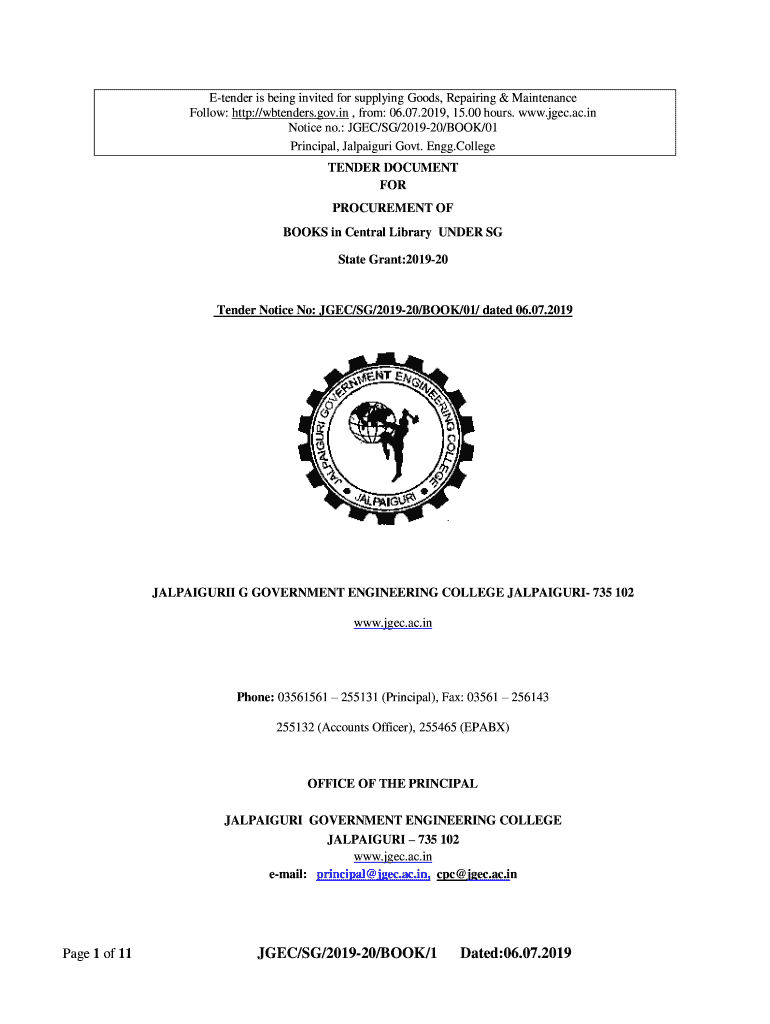 Tender is being invited for supplying Goods, Repairing & Maintenance Follow: http://wbtenders.gov.in, from: 06.07.2019, 15.00 hours. www.jgec.ac.in Notice no.: JG EC/SG/201920/BOOK/01 Principal, Jalpaiguri