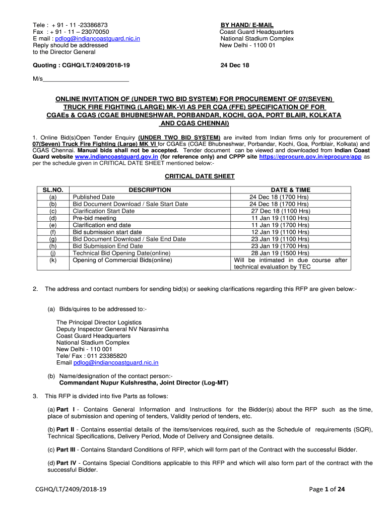 Tell : + 91 11 23386873 Fax : + 91 11 23070050 E mail : pd log indiancoastguard.NIC.in Reply should be addressed to the Director Generally HAND/ EMAIL Coast Guard Headquarters National Stadium Complex