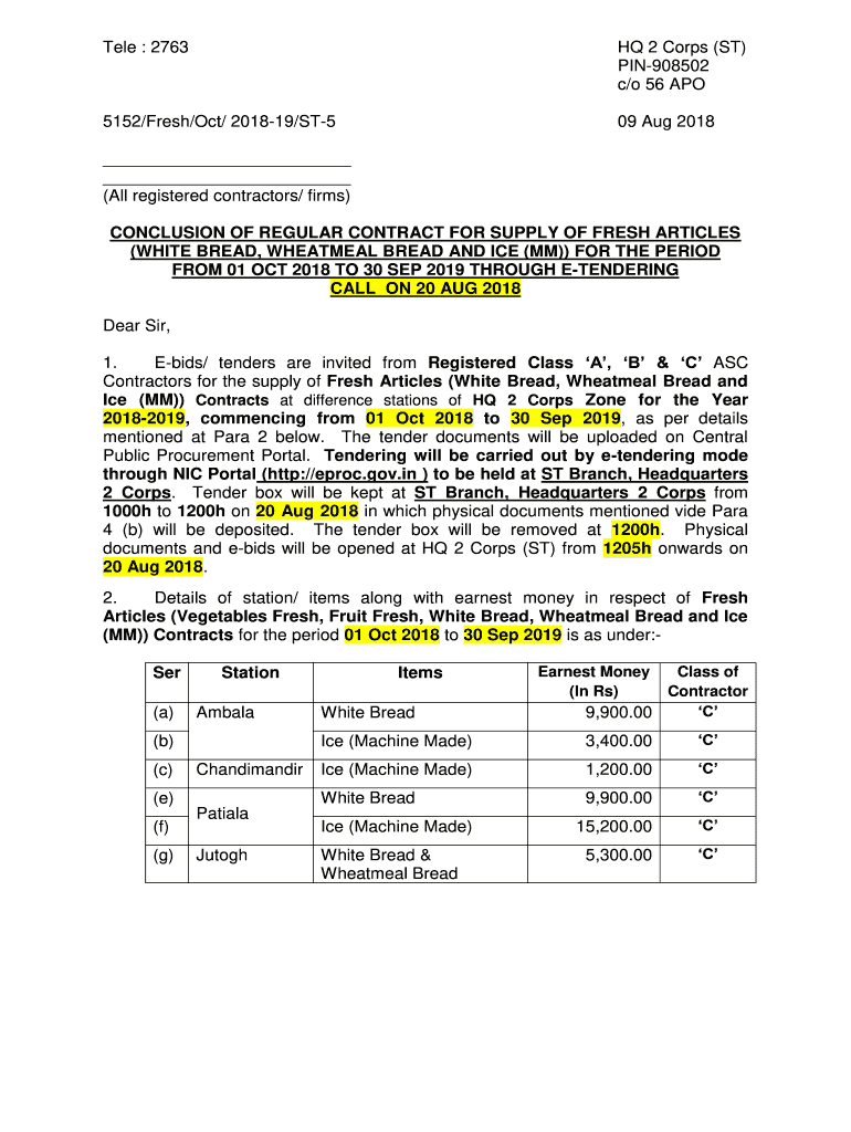 Tell : 2763HQ 2 Corps (ST) PIN908502 c/o 56 APO5152/Fresh/Oct/ 201819/ST509 Aug 2018 (All registered contractors/ firms) CONCLUSION OF REGULAR CONTRACT FOR SUPPLY OF FRESH ARTICLES (WHITE BREAD, WHEATMEAL