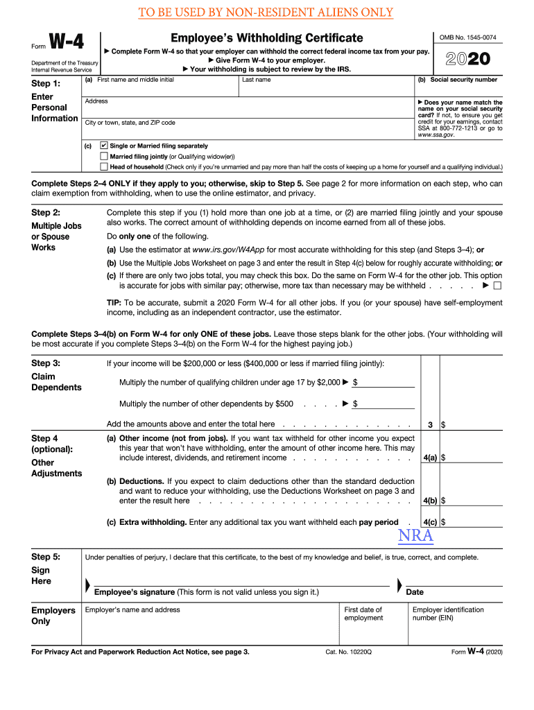 TO BE USED BY NONRESIDENT ALIENS ONLY FormW4Employees Withholding Certificate Department of the Treasury Internal Revenue Services 1: Enter Personal Information OMB No. 15450074Complete Form W4 so