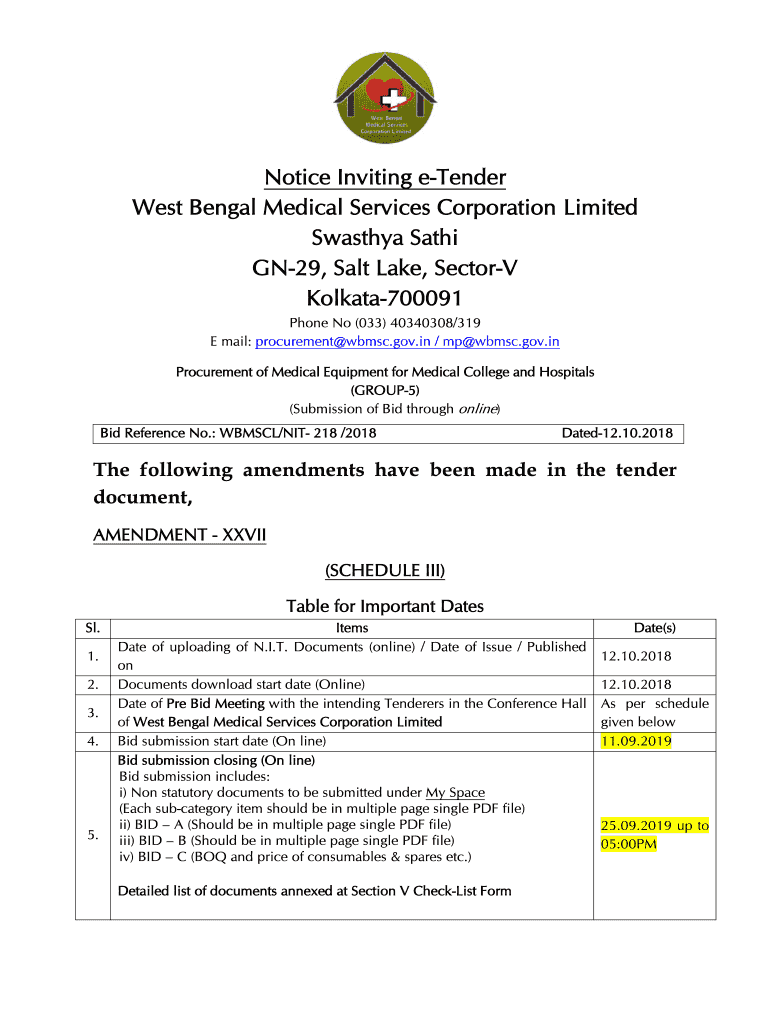Notice Inviting tender West Bengal Medical Services Corporation Limited Swarthy Sat hi GN29, Salt Lake, Sector Kolkata700091 Phone No (033) 40340308/319 E mail: procurement MSC.gov.in / mp MSC.gov.in