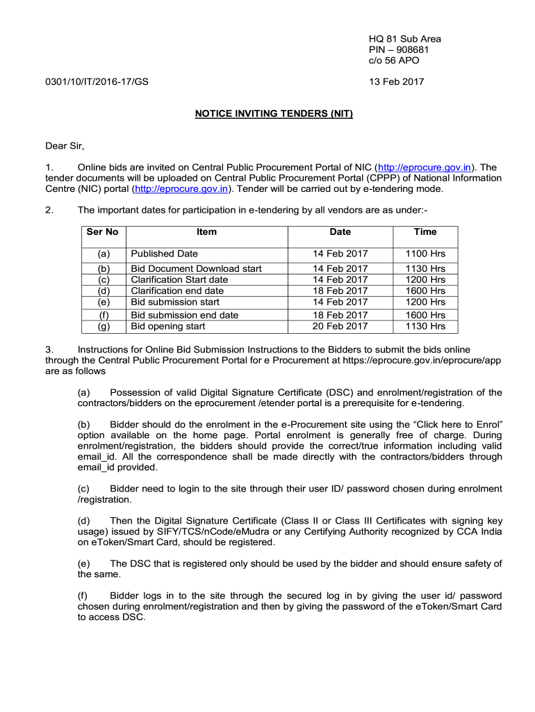 HQ 81 Sub Area PIN 908681 c/o 56 APO 0301/10/IT/201617/GS13 Feb 2017 NOTICE INVITING TENDERS (NIT)Dear Sir, 1. Online bids are invited on Central Public Procurement Portal of NIC (http://eprocure.gov.in).