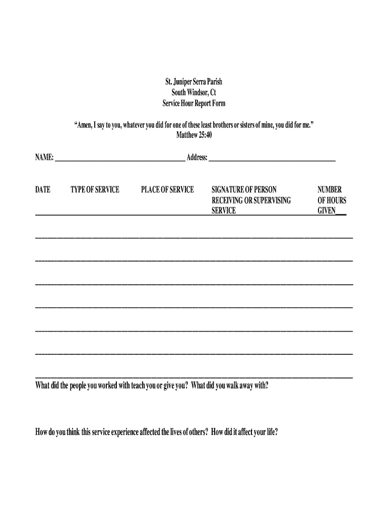 St. Juniper Serra Parish South Windsor, Ct Service Hour Report Form Amen, I say to you, whatever you did for one of these least brothers or sisters of mine, you did for me. Matthew 25:40 NAME: Address: