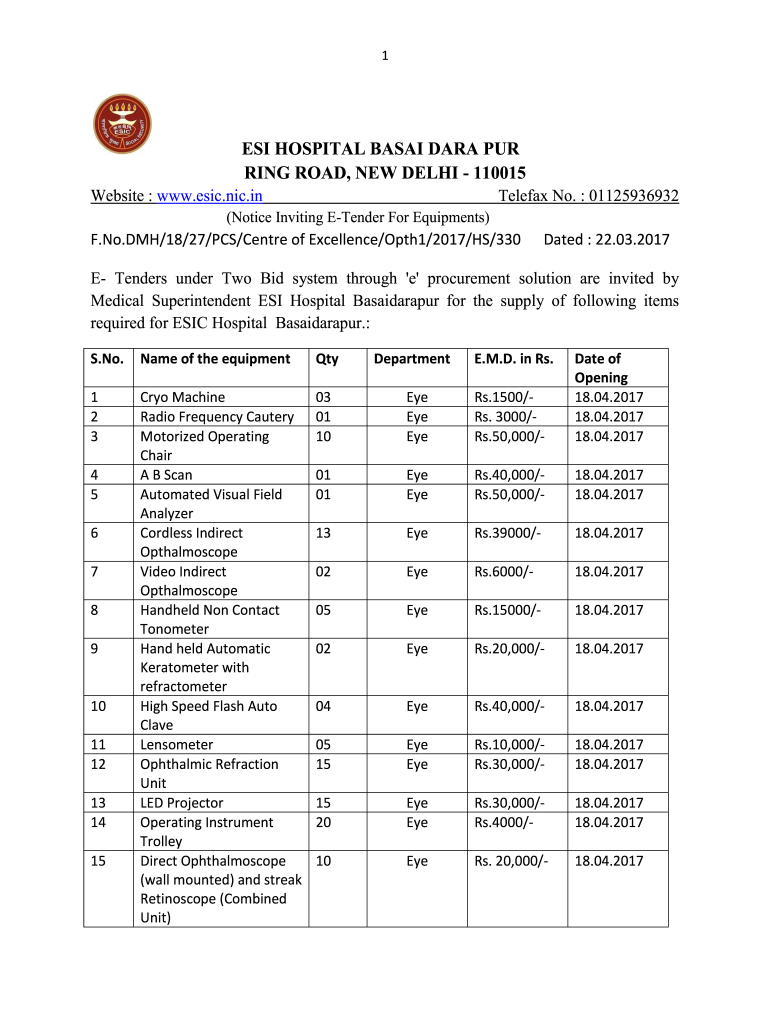 1ESI HOSPITAL BASAL DATA PUR RING ROAD, NEW DELHI 110015Telefax No. 01125936932Website : www.esic.nic.in(Notice Inviting Tender For Equipments)F. No.DMH/18/27/PCS/Centre of Excellence/Opth1/2017/HS/330Dated