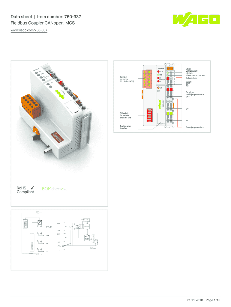 Data sheet Item number:750337 Field bus Coupler CAN open; MCS www.wago.com/75033721.11.2018Page 1/13Data sheet Item number:750337 www.wago.com/750337Item description This bus coupler connects the