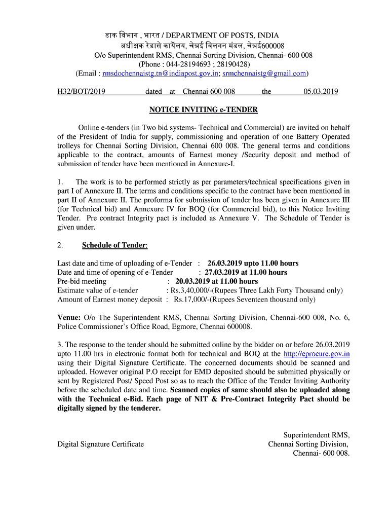 , / DEPARTMENT OF POSTS, INDIA, 600008 O/o Superintendent RMS, Chennai Sorting Division, Chennai 600 008 (Phone : 04428194693 ; 28190428) (Email : rmsdochennaistg.tn Indians.gov.in; srmchennaistg