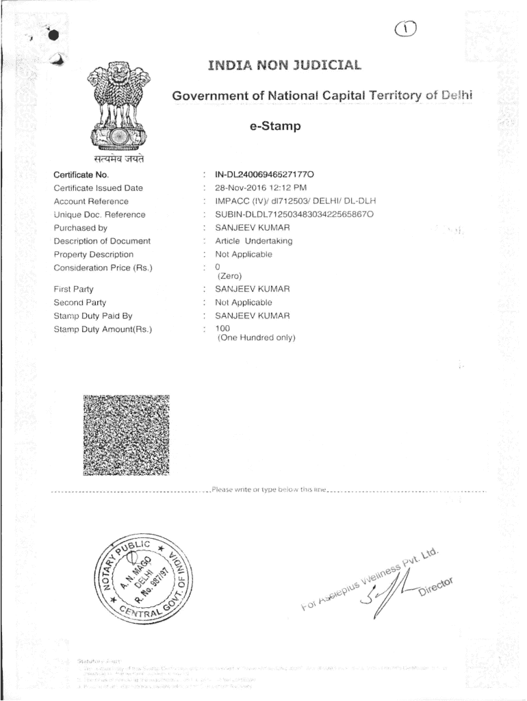 CD INDIA NON-JUDICIAL government.TOF national Capital Territory of Delhi eStampCertificate No.INDL240069465271 770Certificate Issued Date28Nov2016 12:12 Account RelerenceIMPACC (IV)/ d1712503/ DELHI/