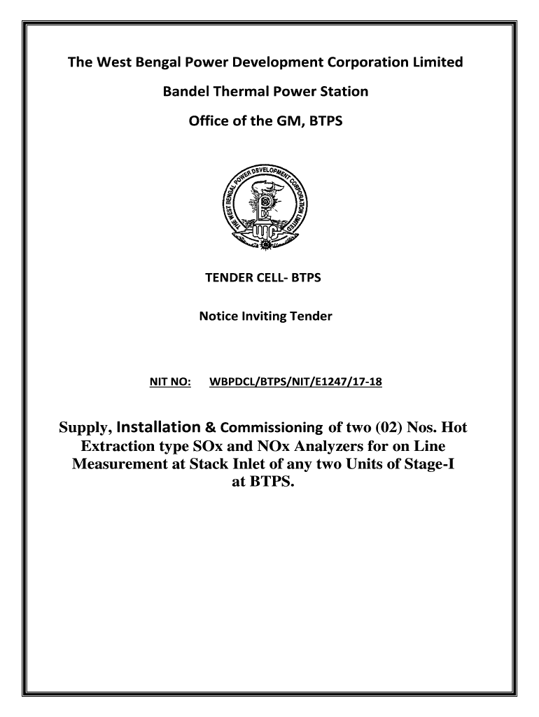 The West Bengal Power Development Corporation Limited Banded Thermal Power Station Office of the GM, BARTENDER CELL BPS Notice Inviting Tenderest NO:ABDUL/BPS/NIT/E1247/1718Supply, Installation &