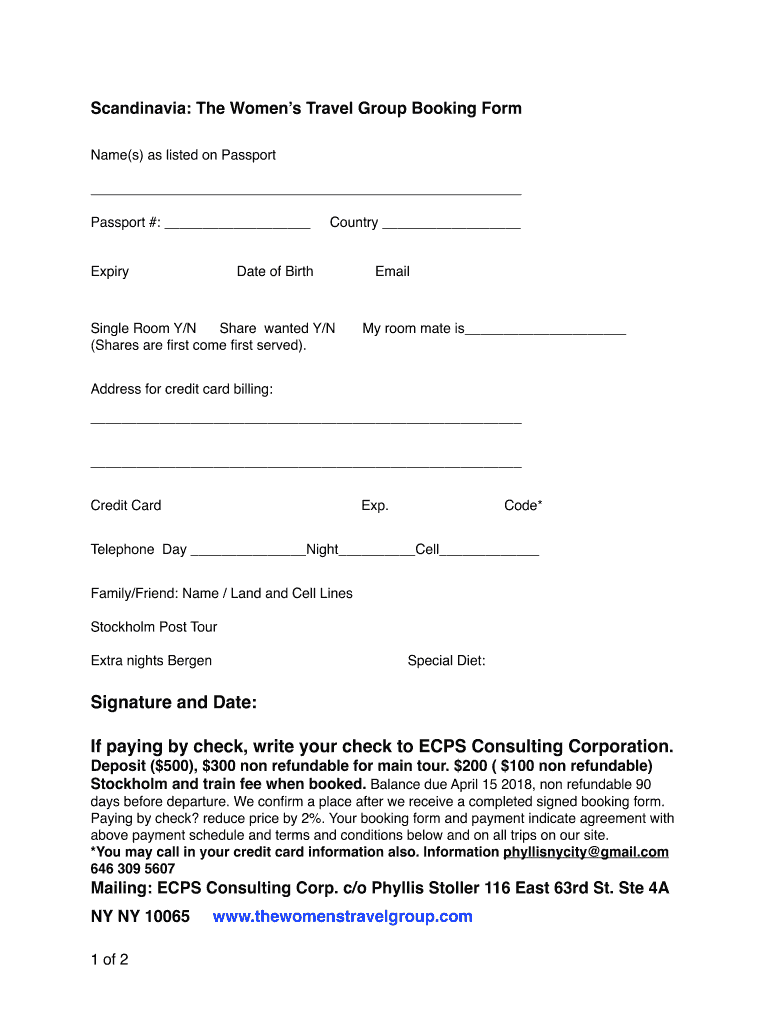 Scandinavia: The Women's Travel Group Booking Form Name(s) as listed on Passport #: ExpiryCountry Date of Birthing Room Y/N Share wanted Y/N (Shares are first come, first served). Email roommate is