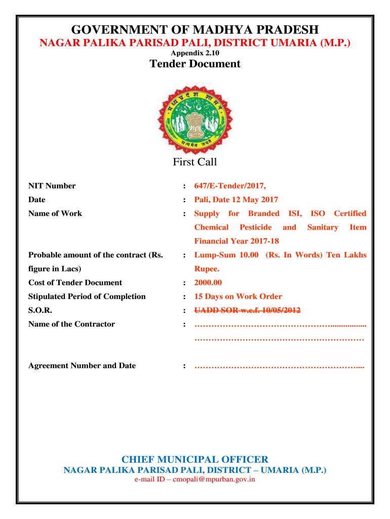 NIT Number: 647/Tender/2017,Date: Pale, Date 12 May 2017Name of Work: SupplyforChemicalBranded