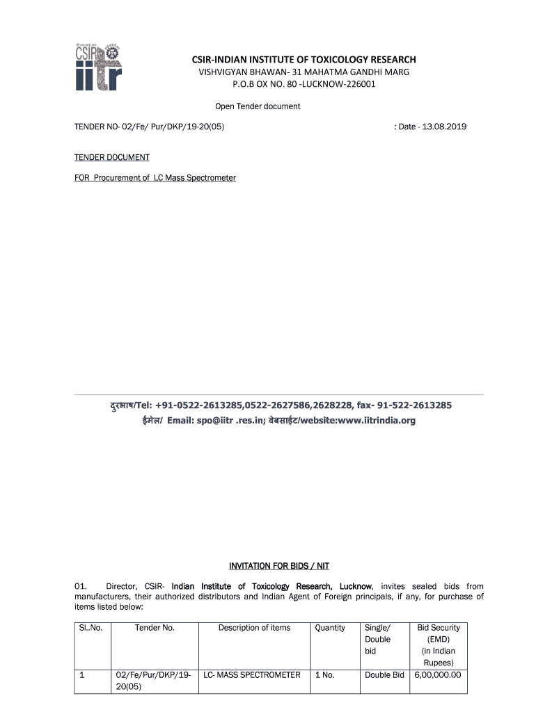 CIRCADIAN INSTITUTE OF TOXICOLOGY RESEARCH VISHVIGYAN SHAWN 31 MAHATMA GANDHI MARY P.O.B OX NO. 80 LUCKNOW226001 Open Tender document TENDER NO 02/Fe/ PUR/DKP/1920(05): Date 13.08.2019TENDER DOCUMENT