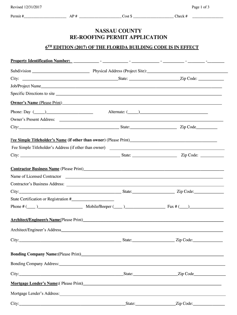 Revised 12/31/2017Page 1 of 3Permit # AP # Cost $ Check # NASSAU COUNTY REPROOFING PERMIT APPLICATION 6TH EDITION (2017) OF THE FLORIDA BUILDING CODE IS IN EFFECT Property Identification Number: Subdivision