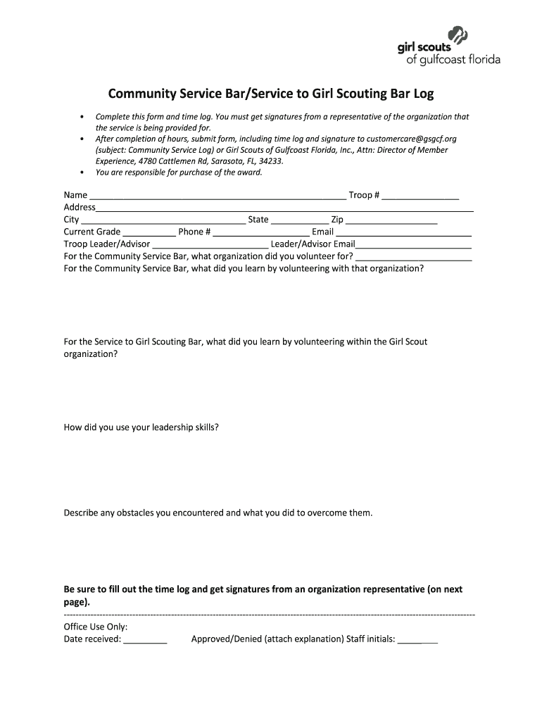 Community Service Bar/Service to Girl Scouting Bar Log Complete this form and time log. You must get signatures from a representative of the organization that the service is being provided for. After