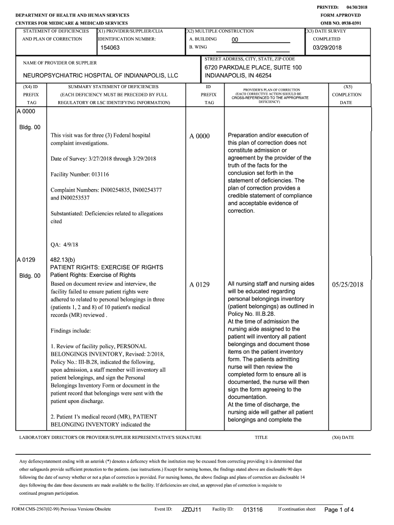 PRINTED: DEPARTMENT OF HEALTH AND HUMAN SERVICES CENTERS FOR MEDICARE & MEDICAID SERVICES STATEMENT OF DEFICIENCIES(X1) PROVIDER/SUPPLIER/LIGAND PLAN OF CORRECTIONIDENTIFICATION NUMBER:15406304/30/2018FORM