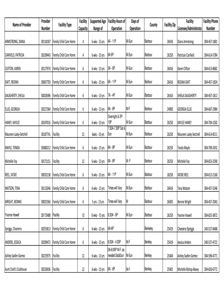 Get the free Name of Provider Provider Number Facility Type Facility Capacity ...