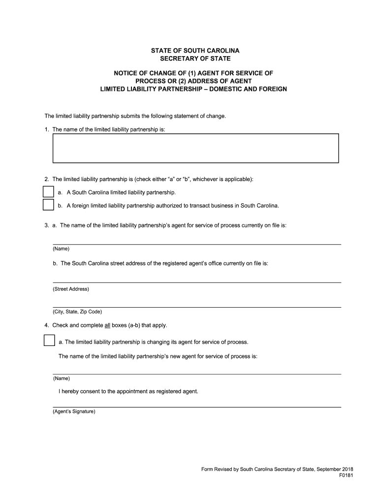 STATE OF SOUTH CAROLINA SECRETARY OF STATE NOTICE OF CHANGE OF (1) AGENT FOR SERVICE OF PROCESS OR (2) ADDRESS OF AGENT LIMITED LIABILITY PARTNERSHIP DOMESTIC AND Foreign limited liability partnership