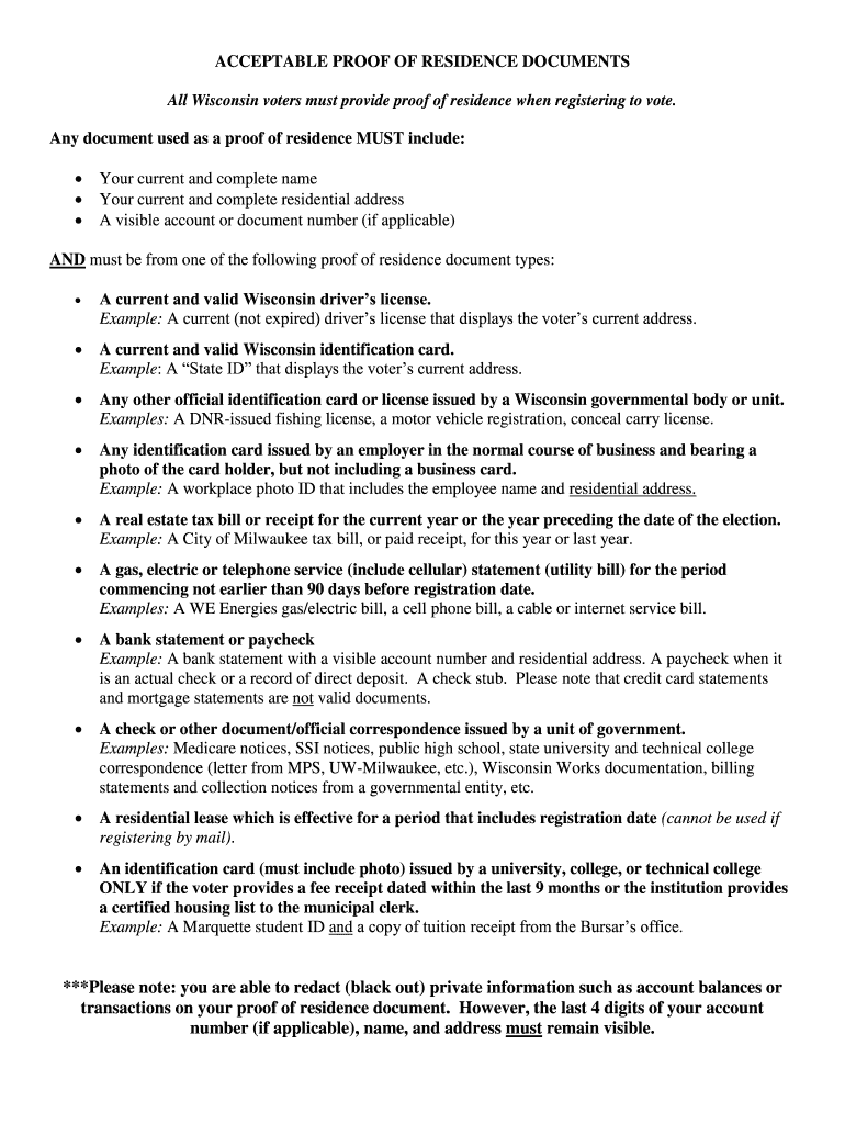 ACCEPTABLE PROOF OF RESIDENCE DOCUMENTS All Wisconsin voters must provide proof of residence when registering to vote. Any document used as a proof of residence MUST include: Your current and complete