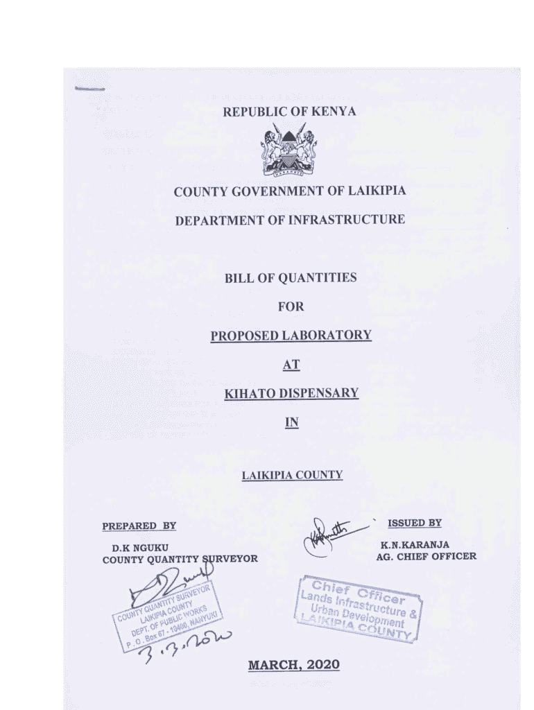 THE COUNTY GOVERNMENT OF LAIKIPIADEPARTMENT OF MEDICAL SERVICES AND PUBLIC HEALTH. O. BOX 127110400, NANYUKISTANDARD TENDER DOCUMENT FOR PROPOSED LABORATORY AT AKIHITO DISPENSARY IN WAIKIKI CONTENDER